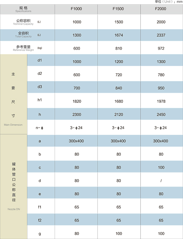 【F1000L\F1500L\F2000L閉式搪玻璃貯罐的技術(shù)參數(shù)】:
