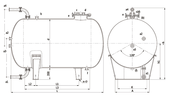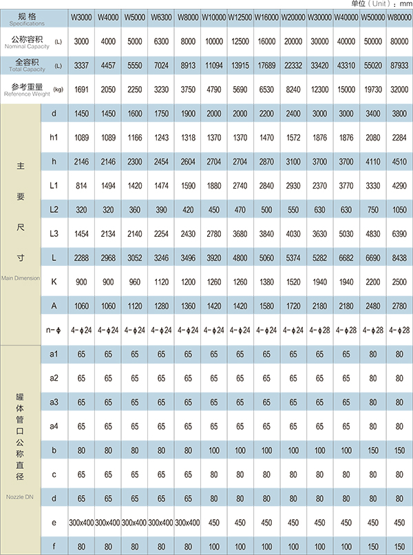 W3000L-W80000L臥式搪玻璃貯罐(臥式搪玻璃儲罐)設(shè)計圖紙及參數(shù)如下所示: