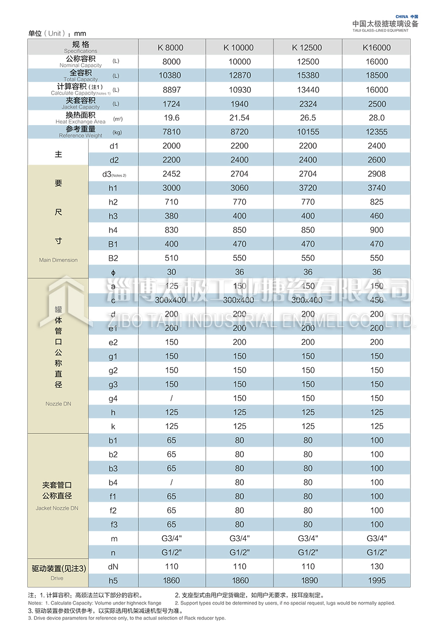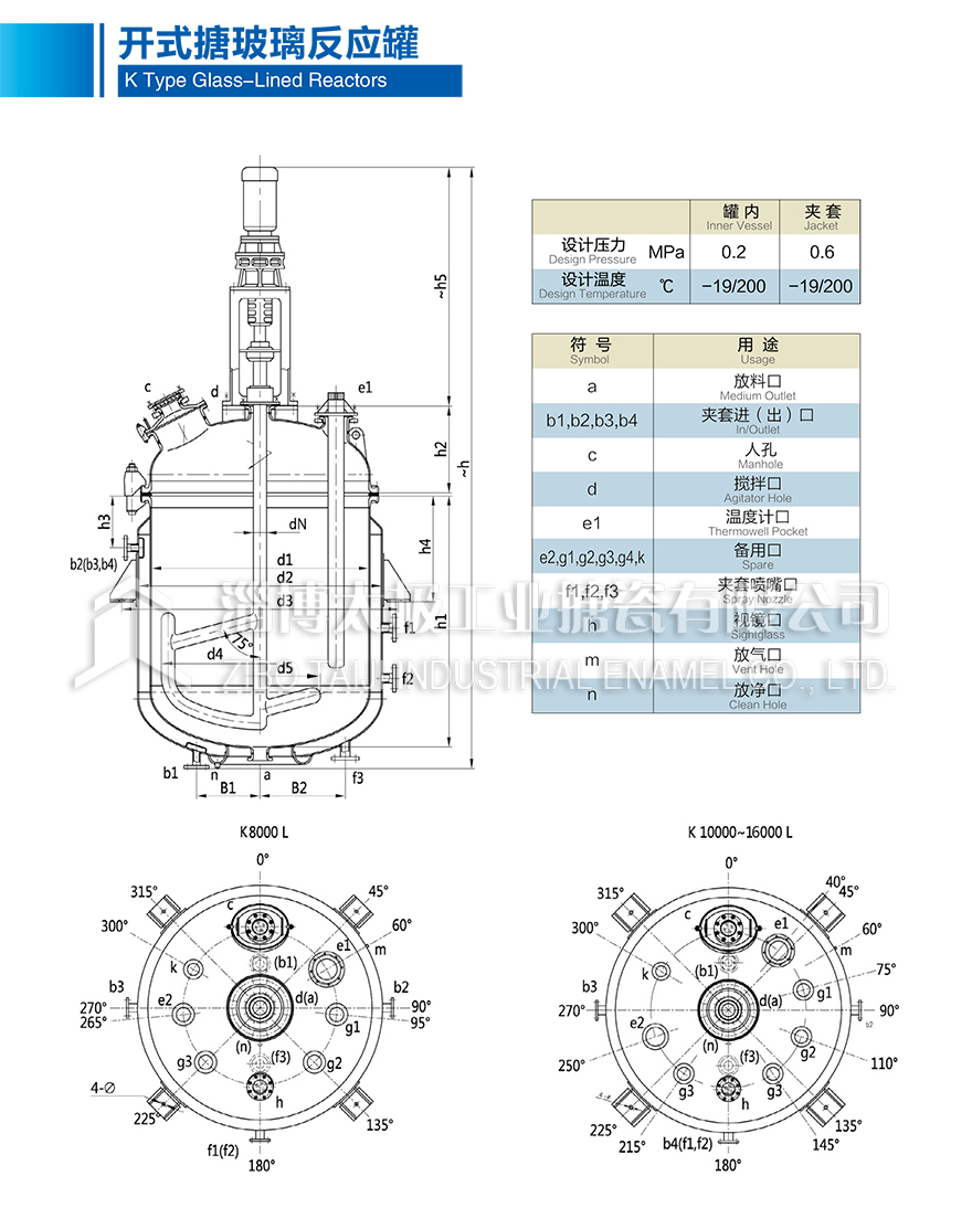 K8000L~K16000L開式搪玻璃反應釜(搪瓷反應釜)設計圖紙及相關參數如下所示: