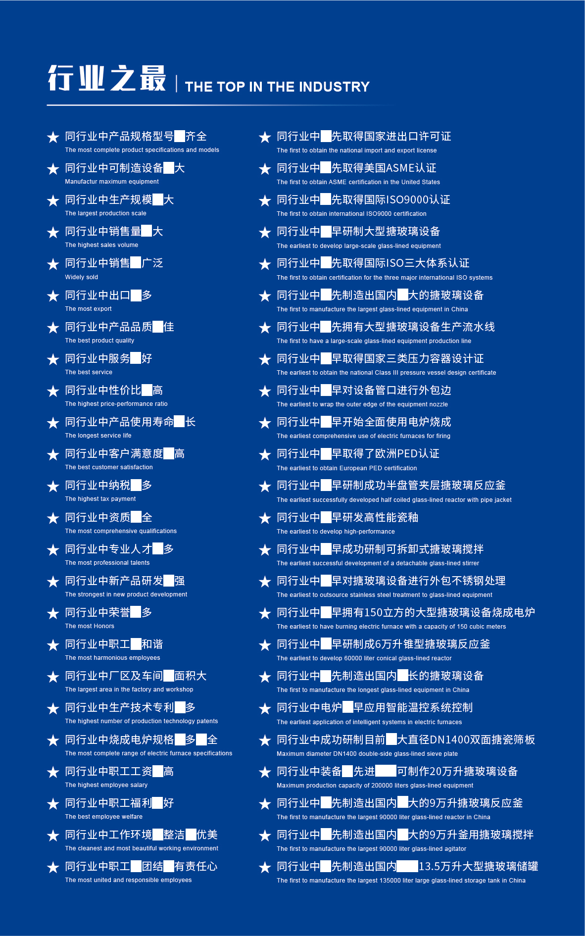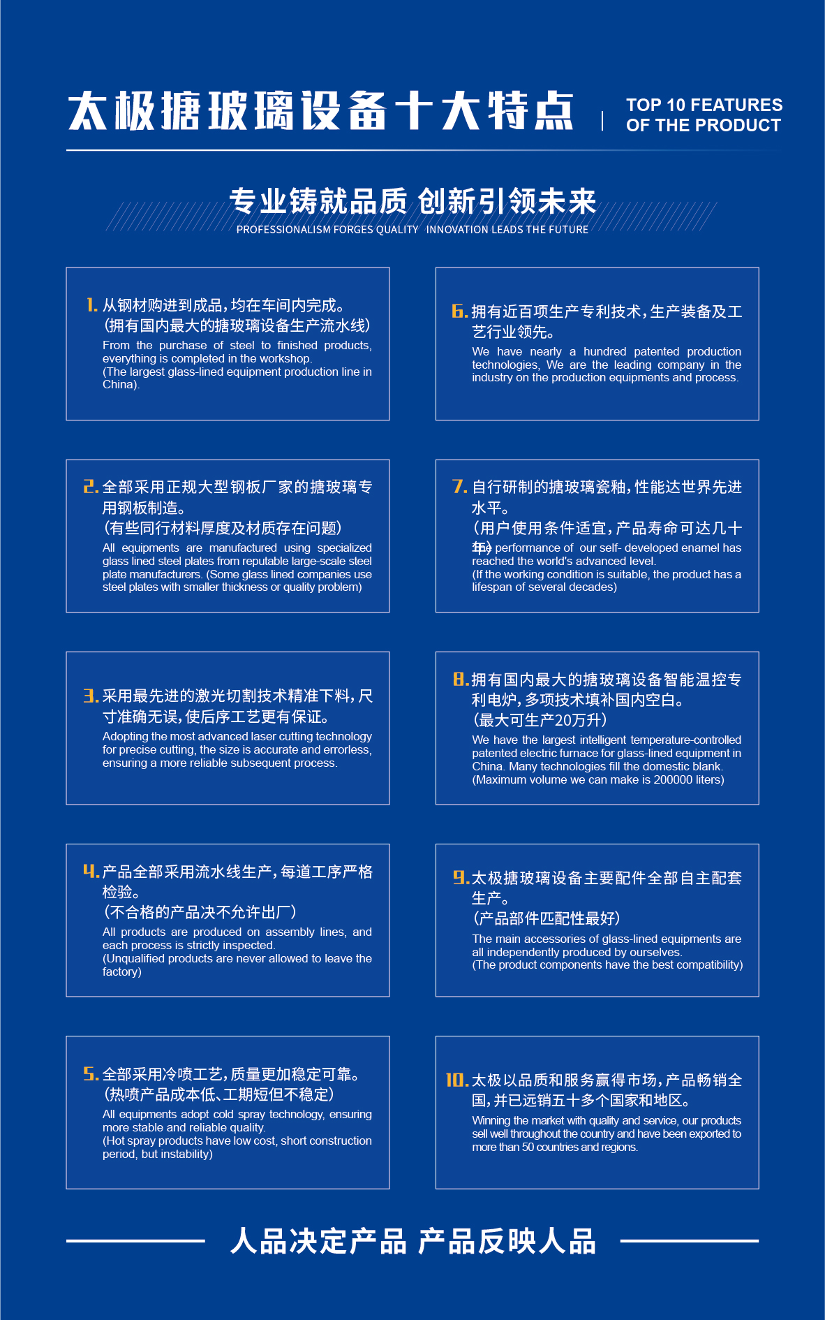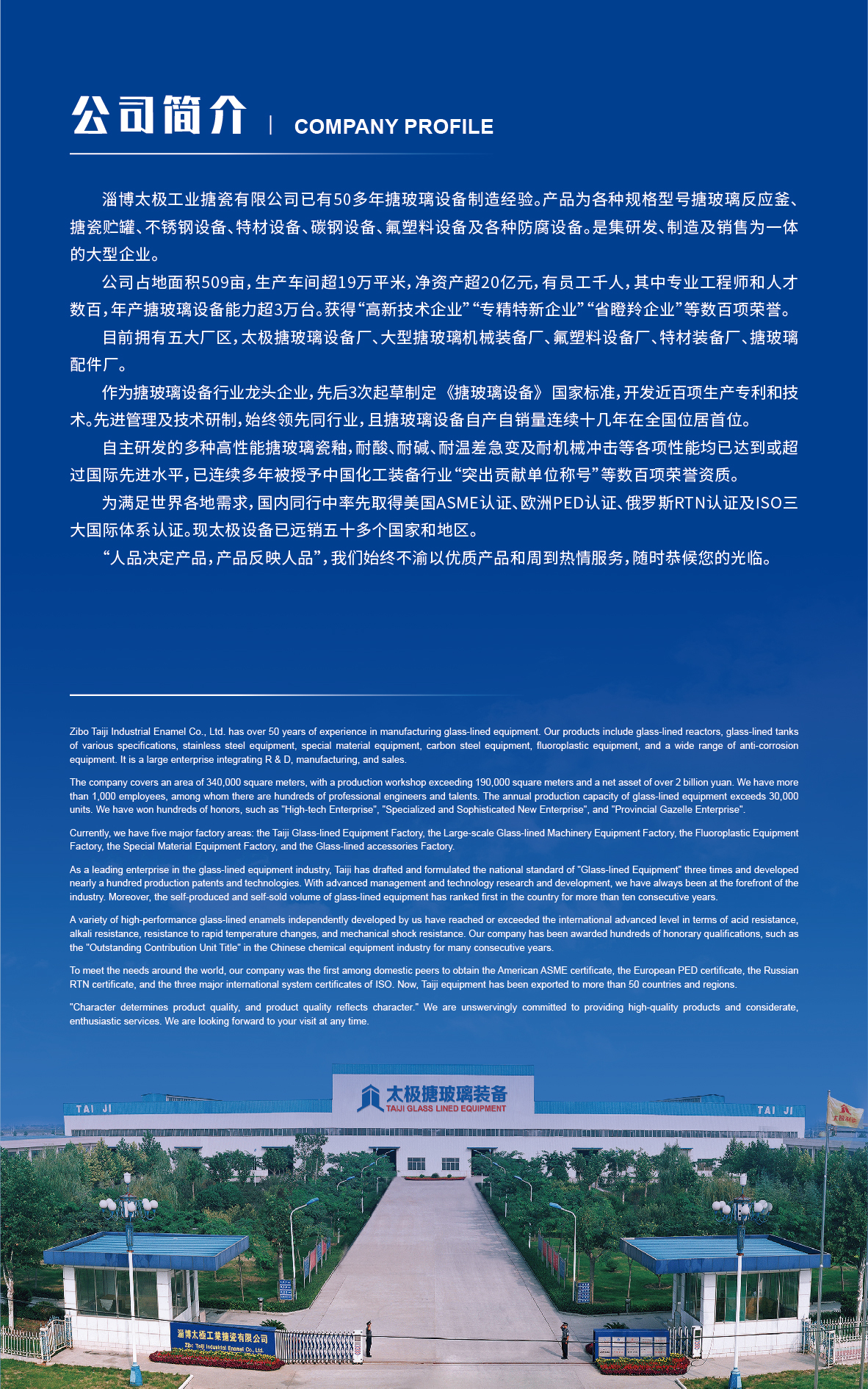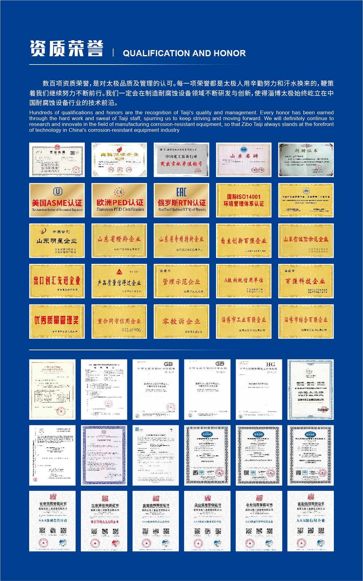 淄博太極在中國搪玻璃設備制造行業中首家通過ISO90001質量體系認證,并擁有美國ASME認證、歐洲PED認證以及國家部門頒發的搪玻璃制造許可證、進出口許可證和百余項榮譽證以及三十六項專利等。